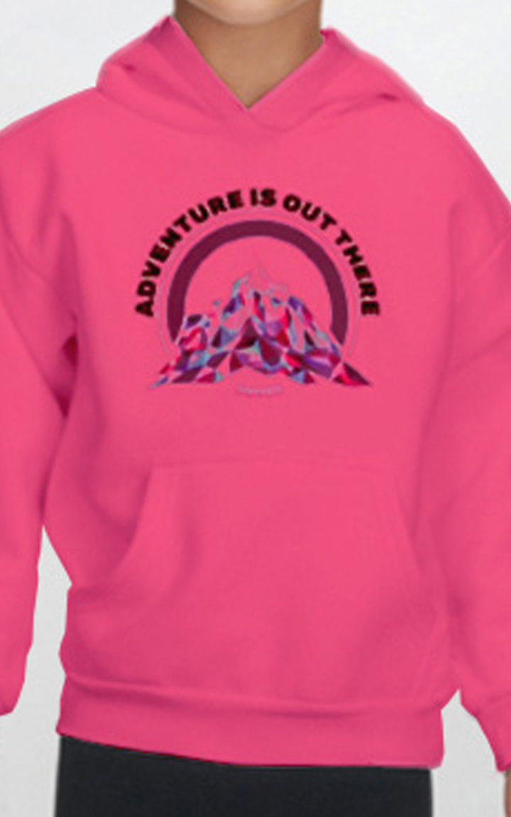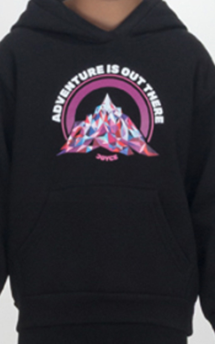 Παιδική μπλούζα φούτερ Joyce “Adventure is Out There” – Μαύρη/φουξ με κουκούλα και τύπωμα βουνού