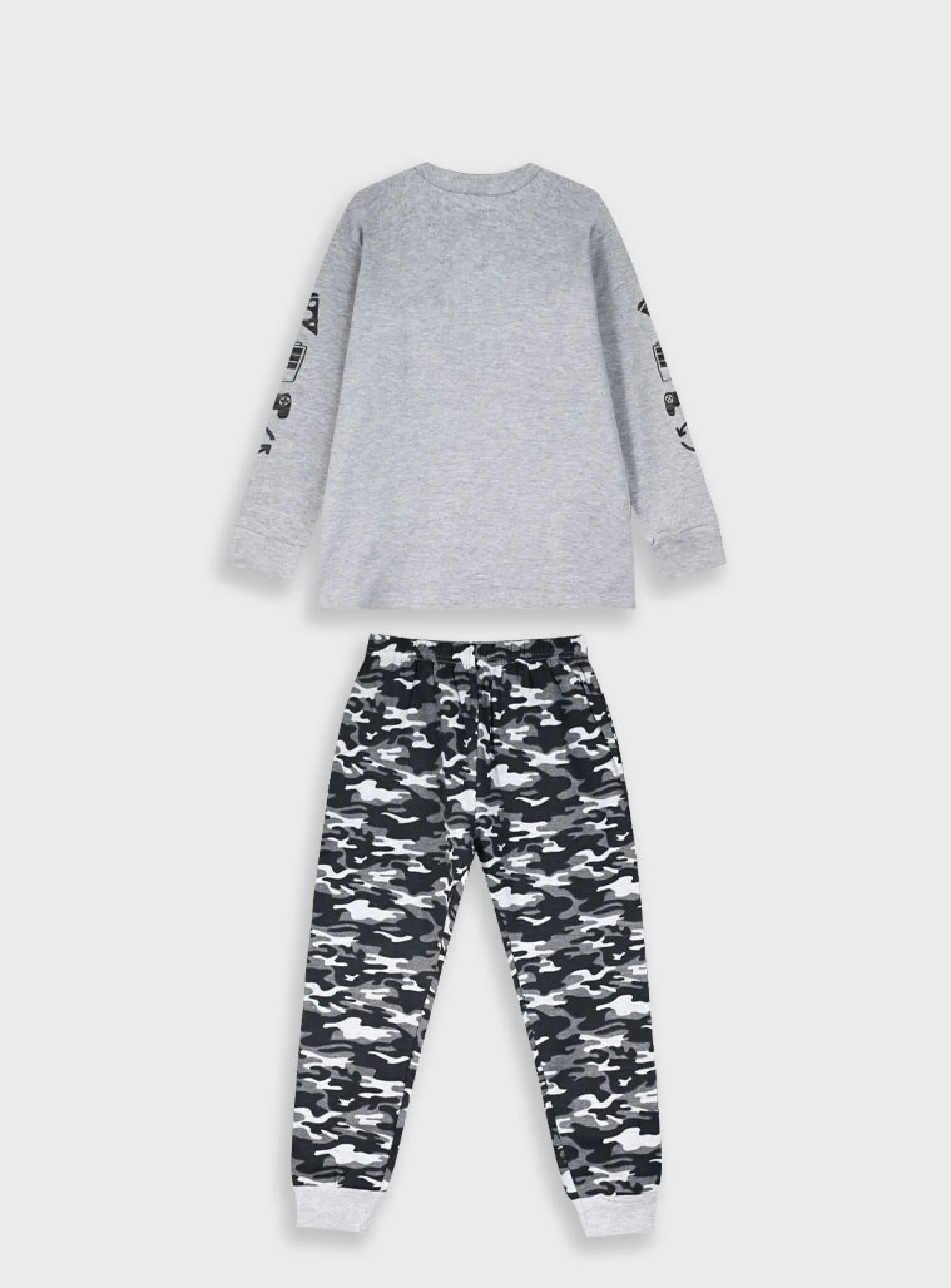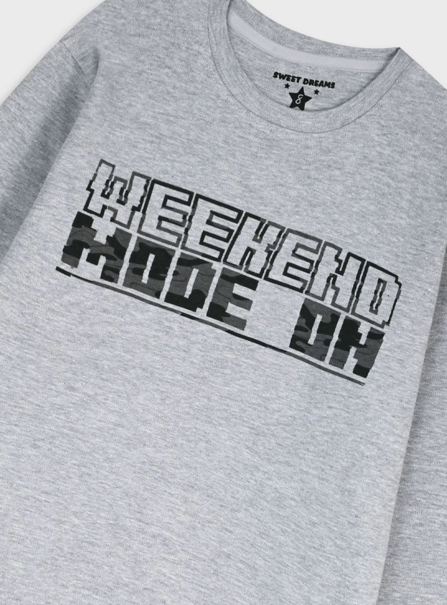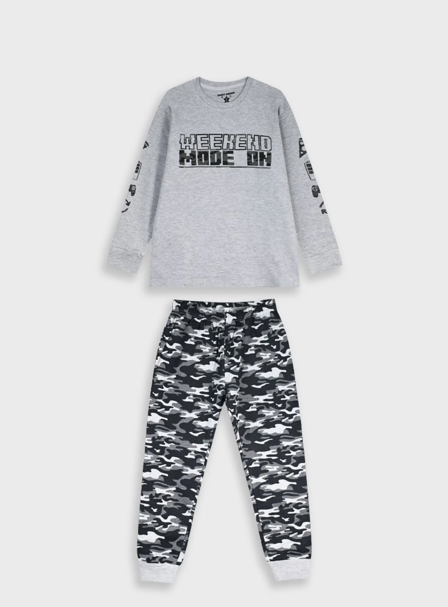 Η μπλούζα σε γκρι με μακρύ μανίκι και τύπωμα “Weekend Mode On” δίνει παιχνιδιάρικη διάθεση, ενώ οι στάμπες στα μανίκια την κάνουν ακόμα πιο μοντέρνα. Το παντελόνι με camo σχέδιο σε αποχρώσεις του γκρι-μαύρου ολοκληρώνει την εικόνα με άνεση και στυλ.