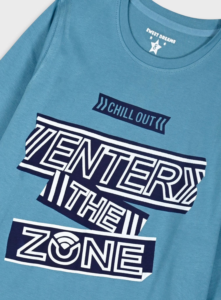 Η παιδική πυζάμα αγοριών Sweet Dreams φέρνει στυλ και άνεση στον ύπνο με το μοντέρνο σύνθημα “Enter the Zone”. Το σετ αποτελείται από μακρυμάνικη μπλούζα σε μπλε πετρόλ απόχρωση με εντυπωσιακό τύπωμα και παντελόνι σε σκούρο μπλε, που χαρίζει πρακτικότητα και ευκολία στις κινήσεις. Φτιαγμένη από μαλακό βαμβακερό ύφασμα, είναι ιδανική για τις κρύες νύχτες, ενώ η άνετη γραμμή της εξασφαλίζει χαλαρό και ξεκούραστο ύπνο. Ένα σχέδιο που συνδυάζει μοντέρνα αισθητική με καθημερινή άνεση, για αγόρια που θέλουν να νιώθουν cool ακόμη και στην πιτζάμα τους.