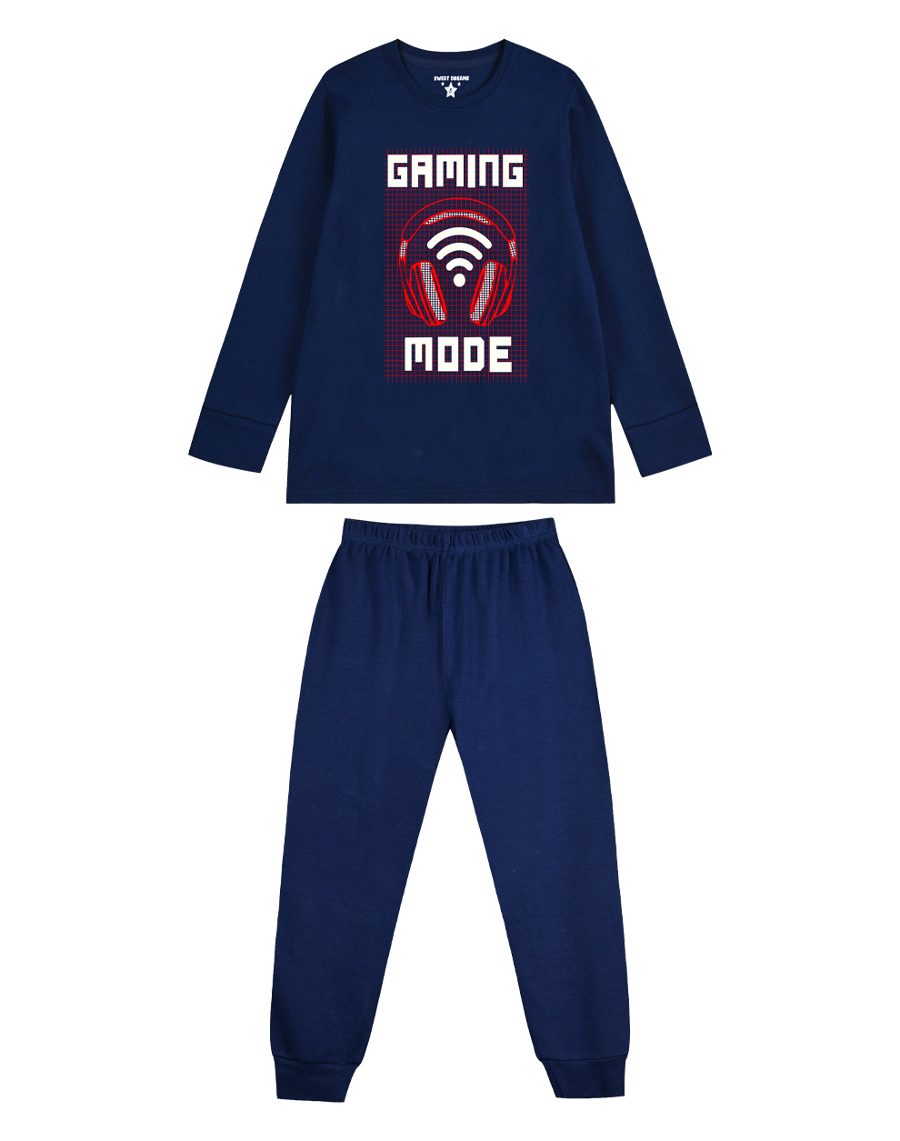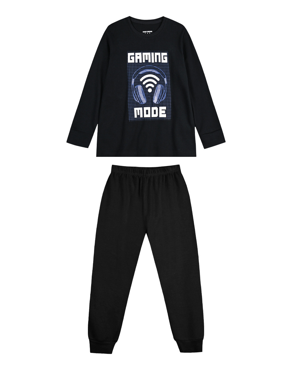 Το σετ περιλαμβάνει μπλούζα με μακρύ μανίκι και στάμπα “Gaming Mode” με ακουστικά και Wi-Fi σήμα, ιδανική για μικρούς gamers που θέλουν να μπαίνουν στη… σωστή διάθεση ακόμα και στον ύπνο! Το παντελόνι είναι απλό, με λάστιχο στη μέση και στους αστραγάλους, για άνεση όλη τη νύχτα.