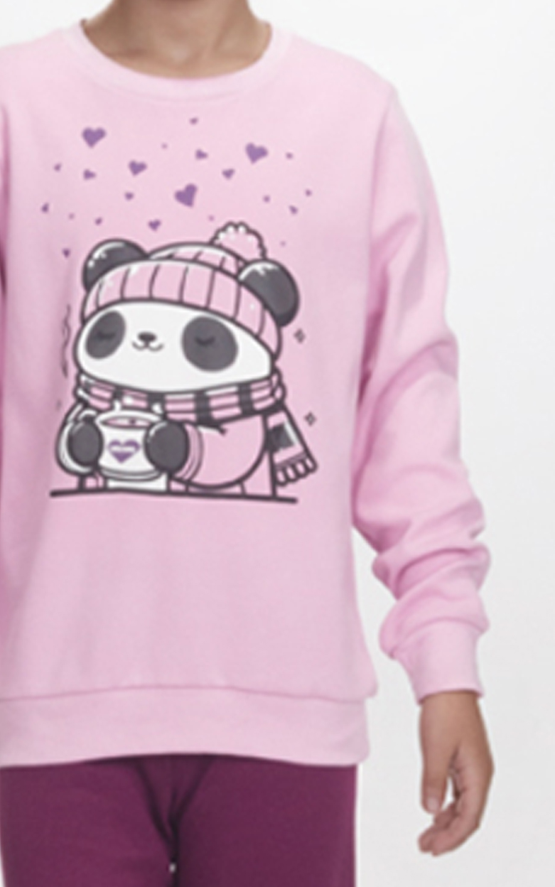 Χαριτωμένη, παιχνιδιάρικη και τόσο άνετη! Η παιδική πυζάμα Joyce έρχεται με μπλούζα σε γλυκό ροζ χρώμα, με τυπωμένο panda ντυμένο χειμωνιάτικα που κλέβει καρδιές. Το παντελόνι σε ματζέντα απόχρωση συμπληρώνει τέλεια το σετ, δίνοντας στυλ ακόμη και στη βραδινή ξεκούραση.