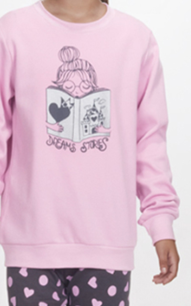 Μπλούζα σε απαλό ροζ χρώμα με σχέδιο κορίτσι που διαβάζει παραμύθι, και παντελόνι σε σκούρο γκρι με ροζ καρδούλες και πουά — ένα σύνολο που μοιάζει να ήρθε κατευθείαν από τα όνειρα.