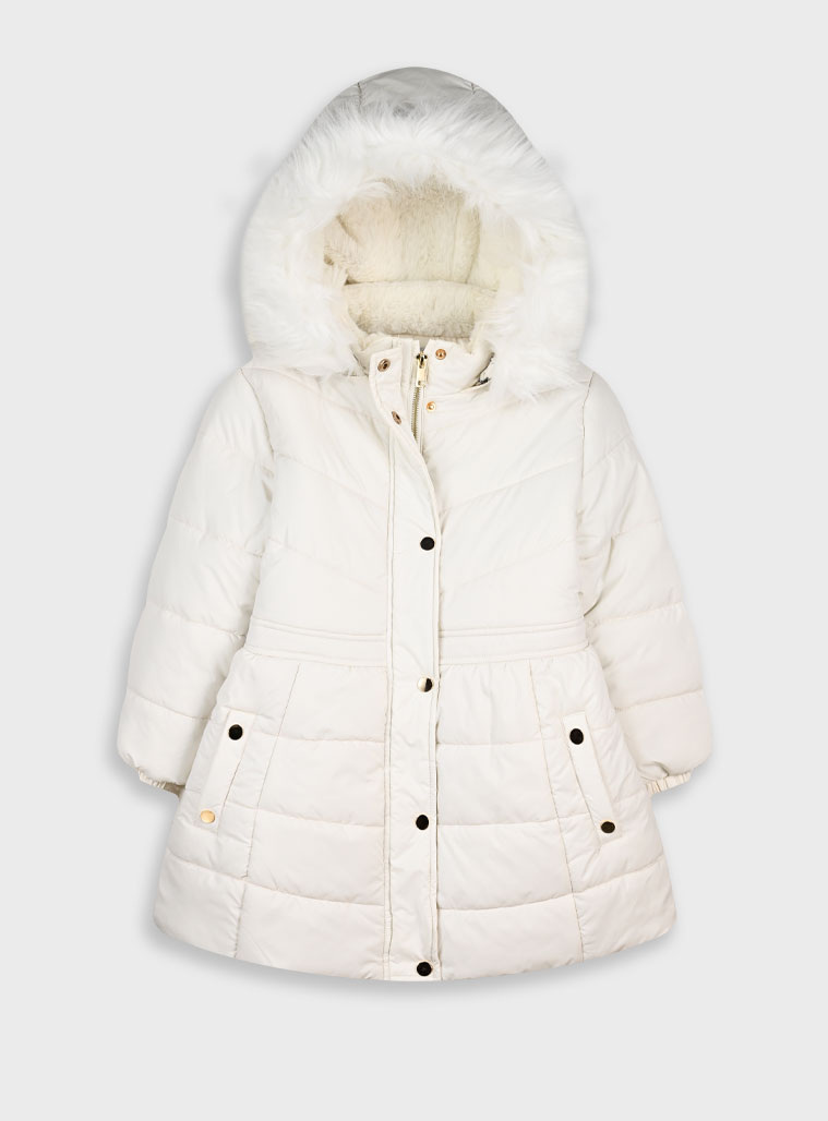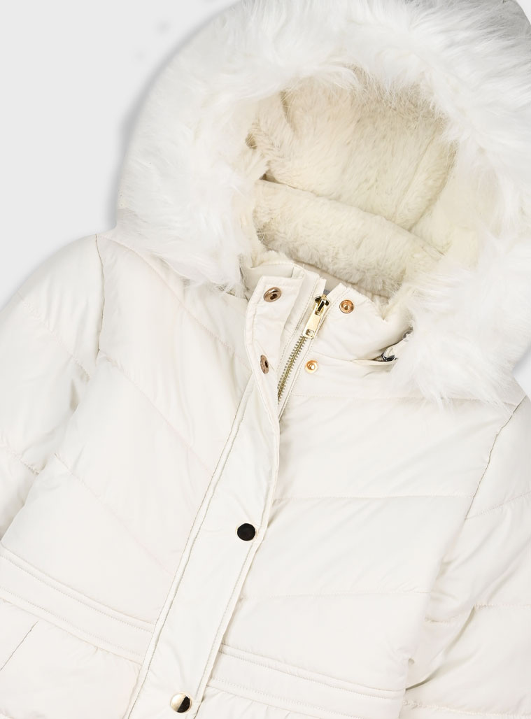 Η λευκή του απόχρωση (πάγος) χαρίζει λάμψη και καθαρότητα, ενώ η κουκούλα με τη γούνινη επένδυση προσφέρει αξεπέραστη αίσθηση πολυτέλειας.
