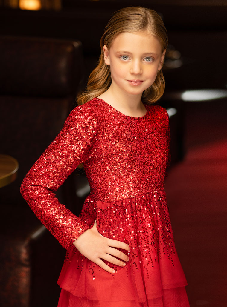 Μαγευτικό κόκκινο φόρεμα γεμάτο παγιέτες που λαμπυρίζουν σε κάθε κίνηση, ιδανικό για τις πιο γιορτινές στιγμές των παιδιών μας. Απολύτως εντυπωσιακό, με άνετη εφαρμογή και υπέροχη διπλή τούλινη φούστα που χαρίζει όγκο και μια «πριγκιπική» αίσθηση χωρίς υπερβολές.