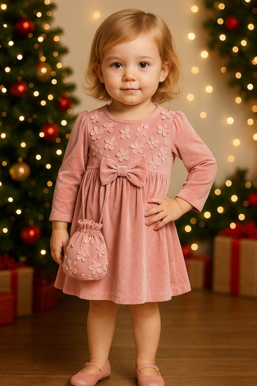 Ρομαντικό ροζ, βελούδινη υφή, απλικέ λουλουδάκια που μοιάζουν να ανθίζουν σε κάθε κίνηση και μια εντυπωσιακή φιόγκο-ζώνη που δίνει όλο το princess vibe χωρίς να το προσπαθεί.
