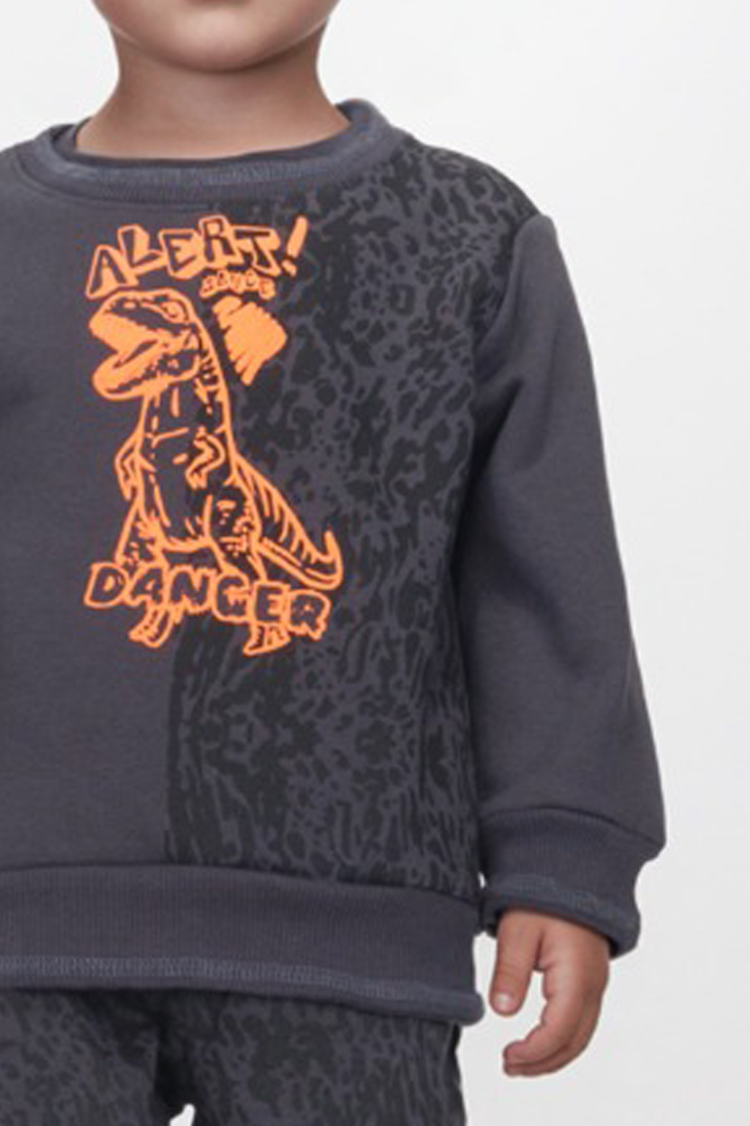 👕 Η μπλούζα φούτερ, σε σκούρο γκρι, ξεχωρίζει με το έντονο πορτοκαλί τύπωμα “ALERT! DANGER” και τον cool δεινόσαυρο που μαγνητίζει τα βλέμματα.