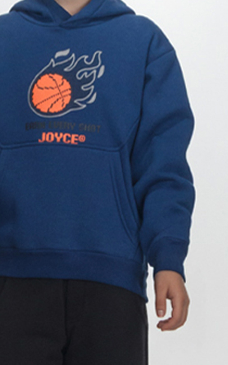 👕 Το μπλε φούτερ με κουκούλα έχει εντυπωσιακό τύπωμα φλεγόμενης μπάλας μπάσκετ και τη λέξη JOYCE σε έντονο πορτοκαλί — γιατί το παιχνίδι θέλει πάθος και ενέργεια!