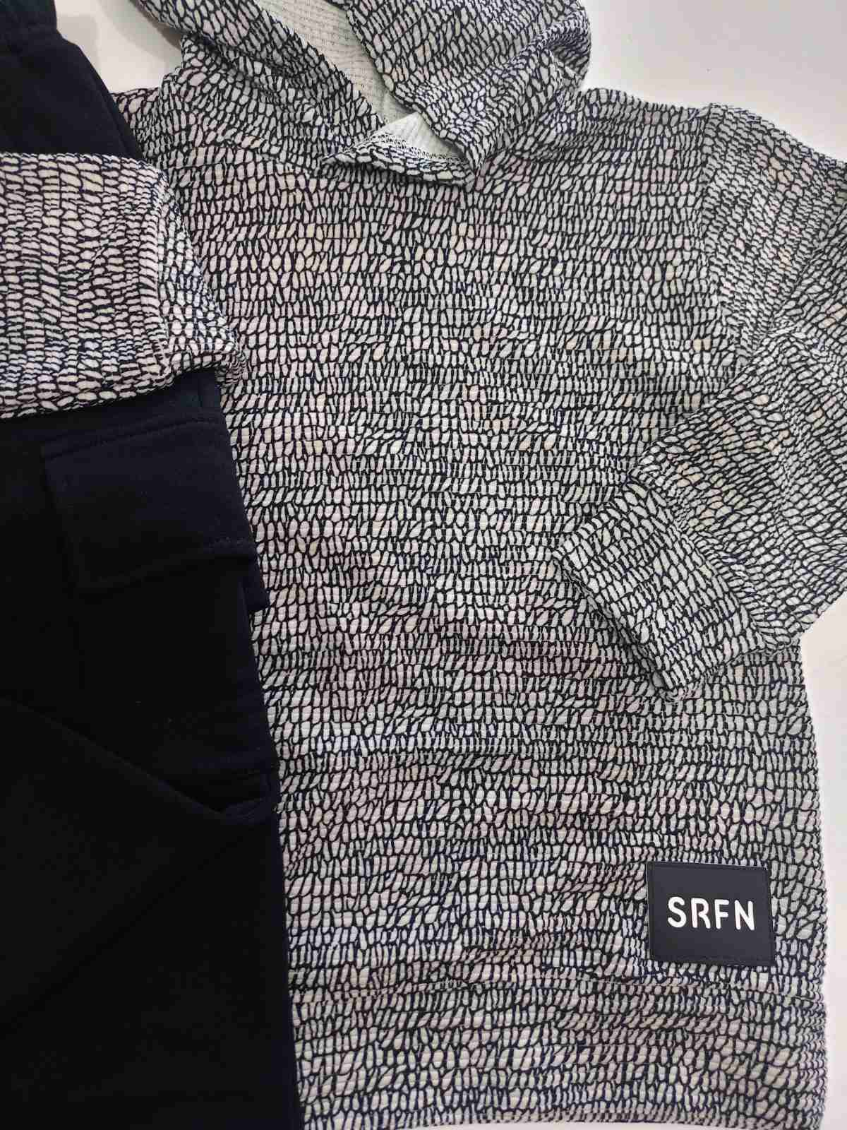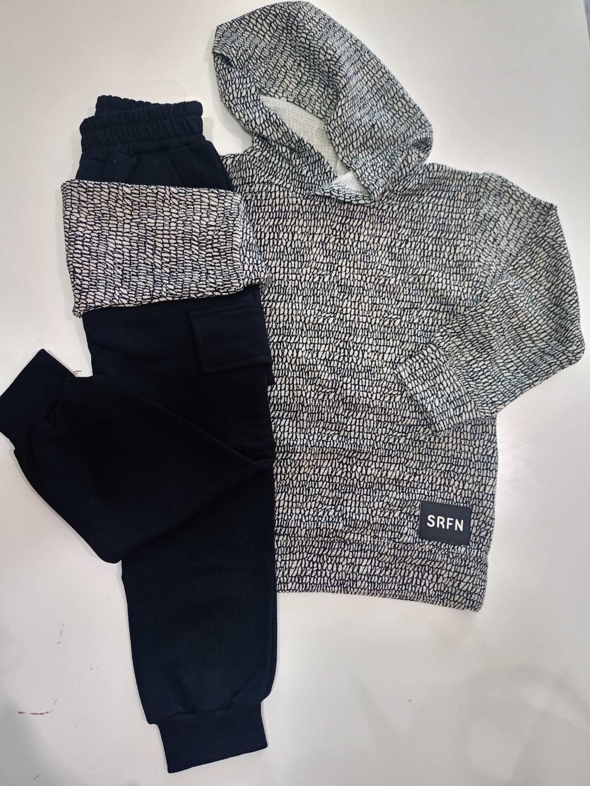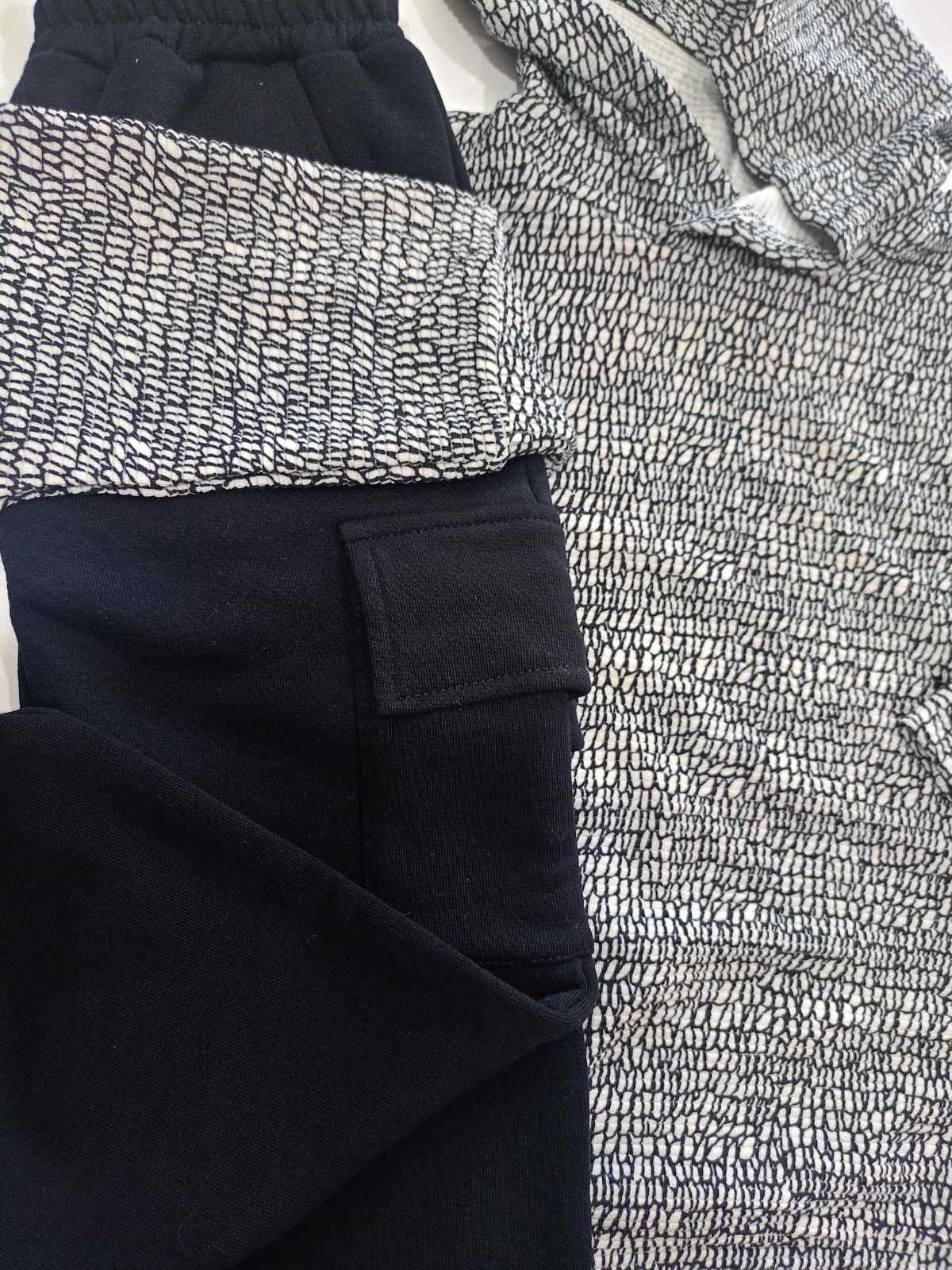 Η φούτερ μπλούζα με κουκούλα και διακριτικό γεωμετρικό σχέδιο χαρίζει μοντέρνο look, ενώ το παντελόνι τύπου cargo με πλαϊνές τσέπες προσφέρει άνεση και πρακτικότητα.