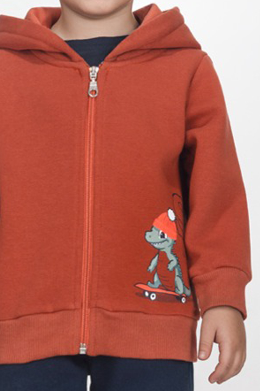 🧥 Η ζακέτα με κουκούλα, σε κεραμιδί απόχρωση, διαθέτει φερμουάρ και χαριτωμένο τύπωμα με δεινοσαυράκι που κάνει skateboard — μια πινελιά χαράς και ενέργειας σε κάθε μέρα!