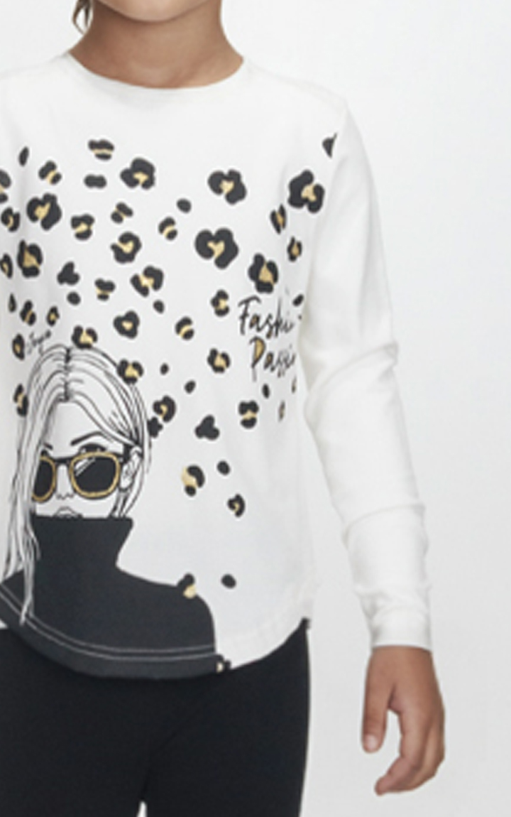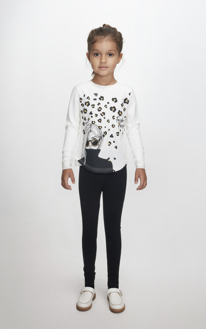 Η εκρού μπλούζα με μακριά μανίκια ξεχωρίζει χάρη στο εντυπωσιακό σχέδιο με fashion φιγούρα και animal print λεπτομέρειες, δίνοντας μια μοντέρνα, urban διάθεση. Συνδυάζεται ιδανικά με το μαύρο κολάν που προσφέρει άνεση και ελευθερία κινήσεων σε κάθε βήμα, από το σχολείο μέχρι το παιχνίδι.