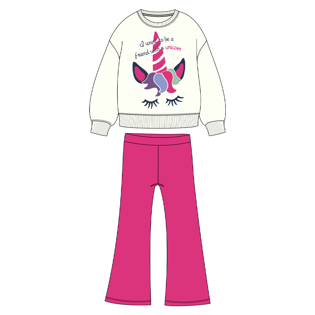 Η μπλούζα σε απαλό λευκό με το χαριτωμένο σχέδιο μονόκερου και το μήνυμα “I want to be a friend with a unicorn” φέρνει φαντασία και χαμόγελα. Το παντελόνι σε έντονο φούξια χρώμα, με ελαφρώς καμπάνα γραμμή, δίνει μια fashionable πινελιά που θα ξετρελάνει τις μικρές μας φίλες.