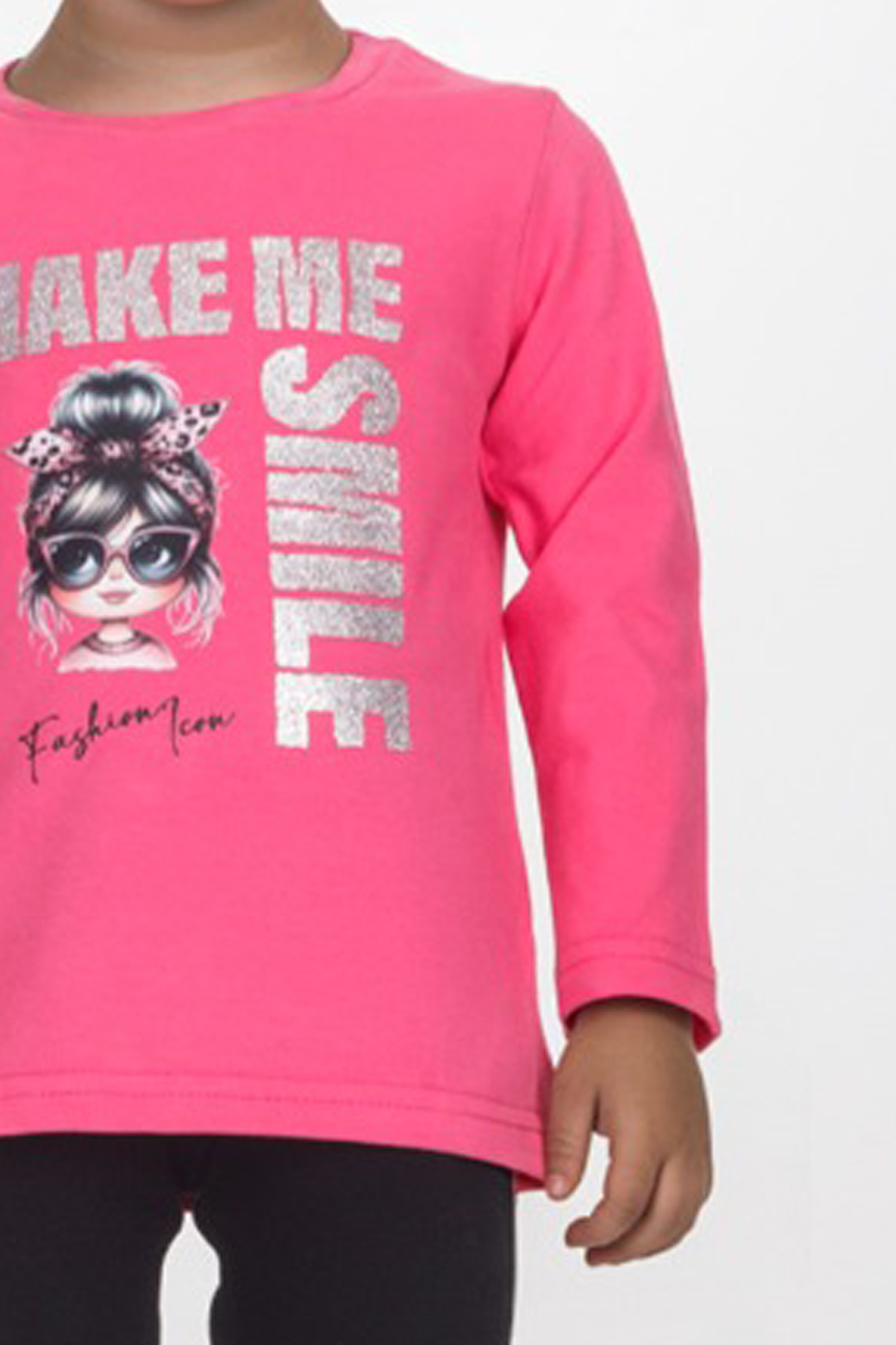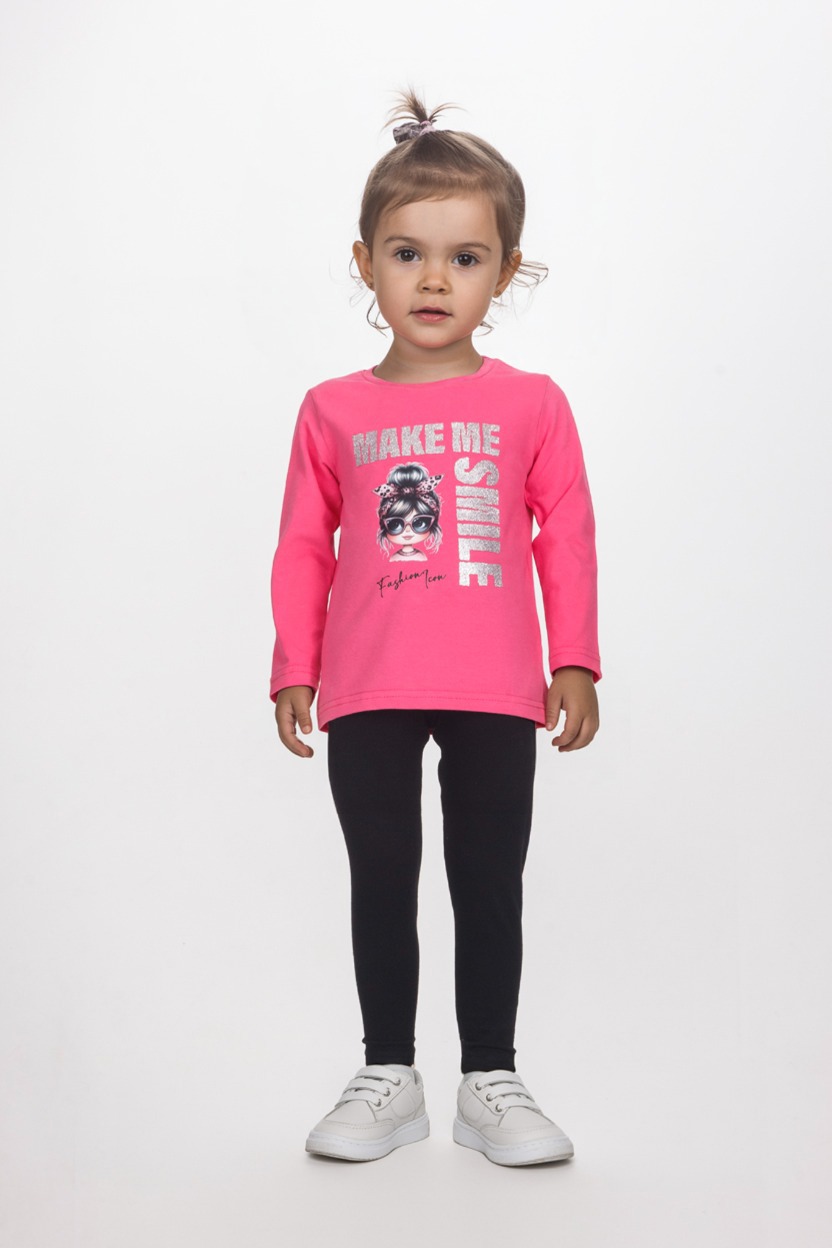 Ένα άνετο και στυλάτο παιδικό σετ κολάν Joyce που θα κάνει κάθε μικρή μας φίλη να χαμογελά! Η φούξια μπλούζα με στάμπα “Make Me Smile” και λαμπερά γράμματα συνδυάζει παιχνιδιάρικη διάθεση με μοντέρνο στυλ, ενώ η εικονογράφηση στη μπροστινή όψη χαρίζει fashion χαρακτήρα που ξεχωρίζει.