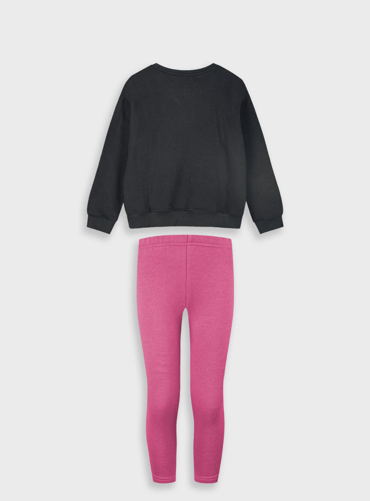 Το παιδικό σετ κολάν αποτελείται από μαύρη μπλούζα φούτερ με έντονο φούξια τύπωμα GRL PWR και κολάν στο ίδιο φωτεινό φρεζ, για μια αντίθεση που δεν περνά απαρατήρητη.