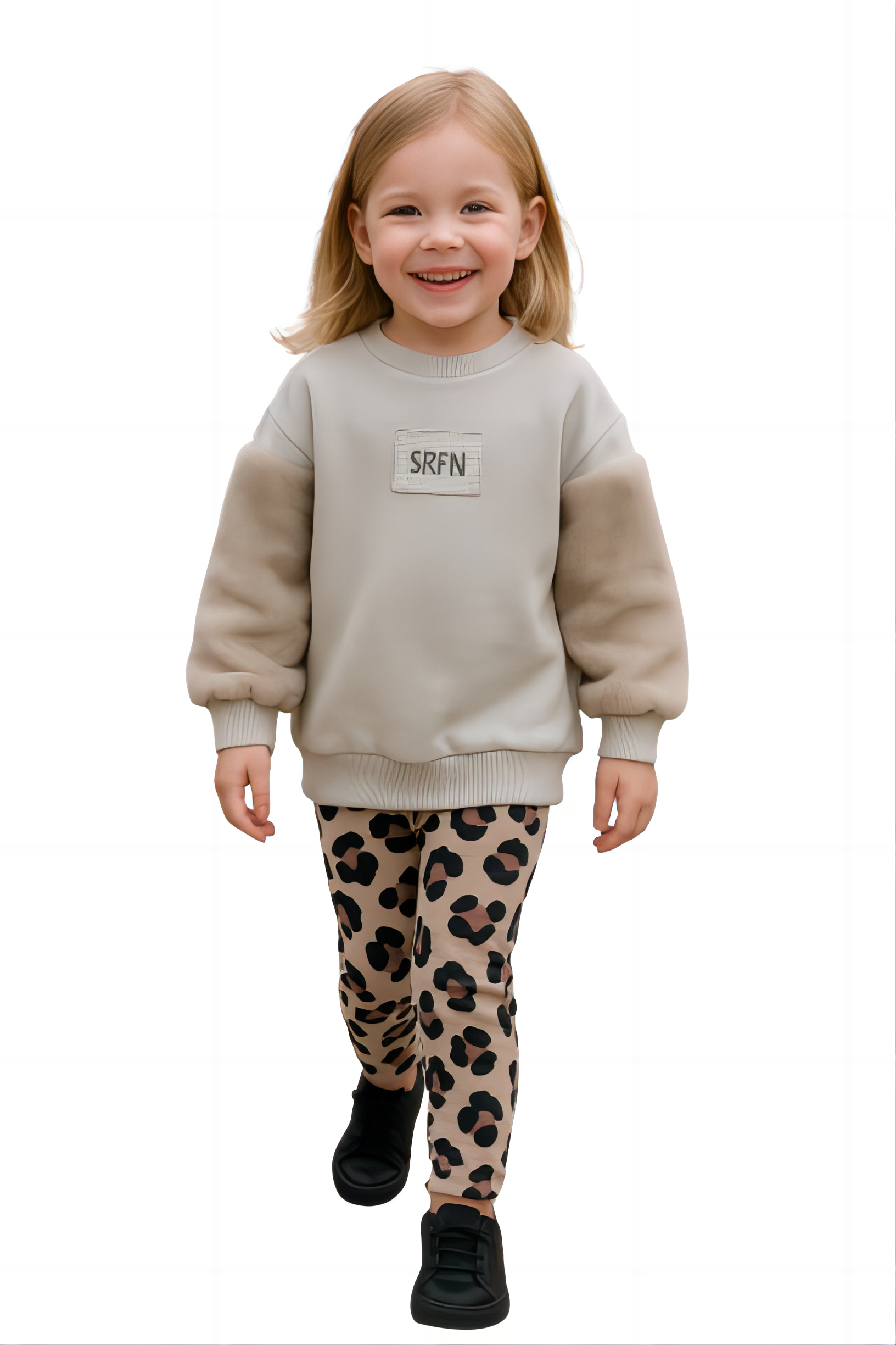 Η μπεζ μπλούζα με balloon μανίκια και διακριτικό patch SRFN στο στήθος συνδυάζεται τέλεια με το leopard κολάν — για μικρές fashionistas που αγαπούν τη ζεστασιά αλλά δεν κάνουν ποτέ εκπτώσεις στο στυλ.