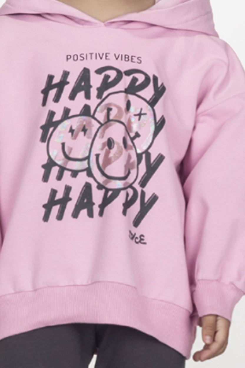 👚 Ροζ φούτερ με κουκούλα και τύπωμα “Happy Happy Happy” με ιριδίζουσες λεπτομέρειες και τη φράση Positive Vibes που γεμίζει τη μέρα αισιοδοξία! Η χαλαρή του γραμμή και οι μανσέτες στους καρπούς εξασφαλίζουν άνεση και στυλ.