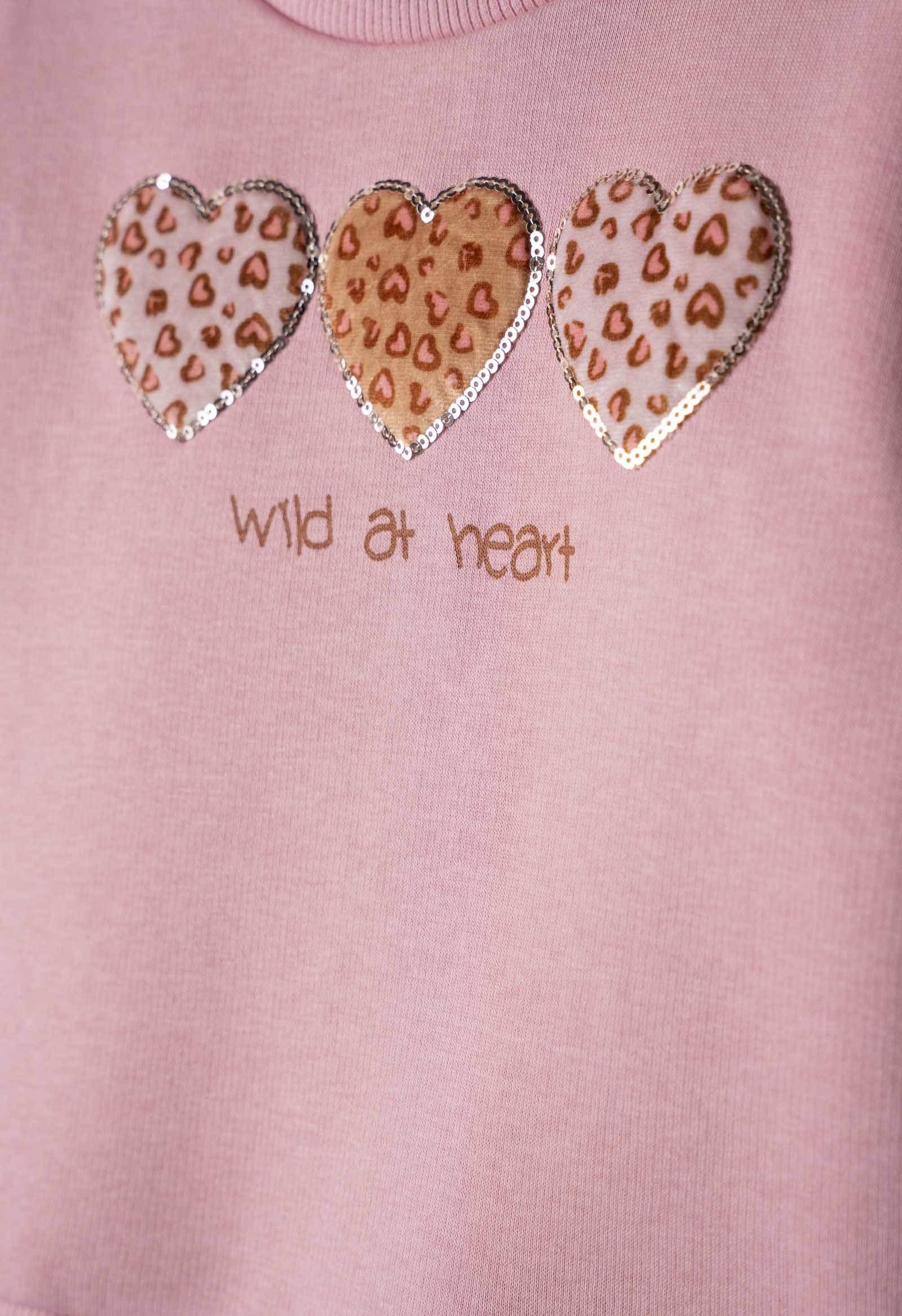Το μπλουζάκι σε απαλό ροζ χρώμα αγκαλιάζει το παιδί με τη ζεστασιά του και στολίζεται με τρεις καρδούλες λεοπάρ — κάθε μία και μια μικρή λάμψη, με παγιέτες που “πιάνουν” το φως και κάνουν το βλέμμα να σταματάει. Κάτω από αυτές, το “wild at heart” μας θυμίζει όμορφα πως κάθε παιδί έχει έναν μικρό, δυνατό χαρακτήρα μέσα του.