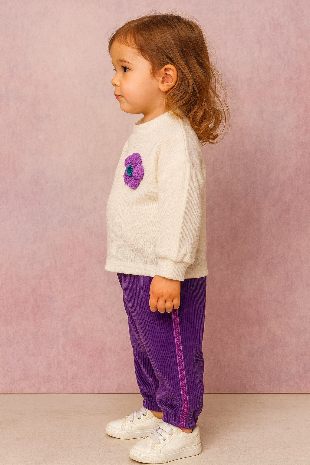 Το παντελόνι σε υπέροχο μωβ χρώμα είναι φτιαγμένο από μαλακό κοτλέ, με λάστιχο στον αστράγαλο για άνετη εφαρμογή και στυλ που λέει «ναι, είμαι παιδί, αλλά έχω άποψη». Η διακριτική λαμπερή ρίγα στο πλάι δίνει μια μικρή νότα λάμψης – τόσο όσο πρέπει.