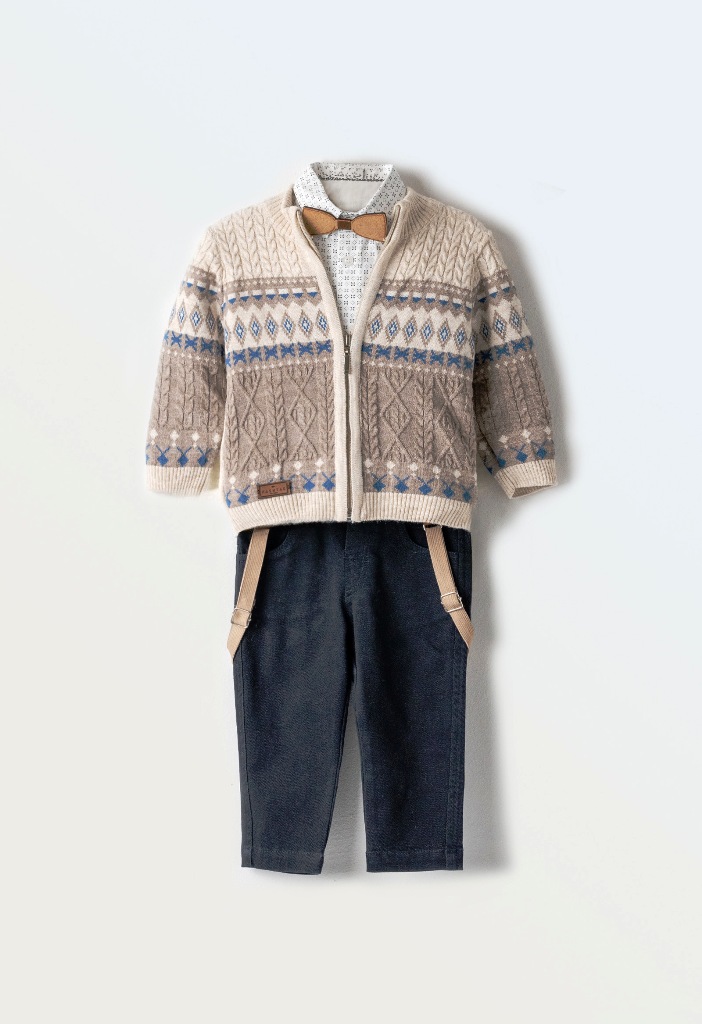 Βρεφικό σετ 3 τμχ ζακέτα με σχέδιο, πουκαμισάκι & παντελόνι με τιράντες