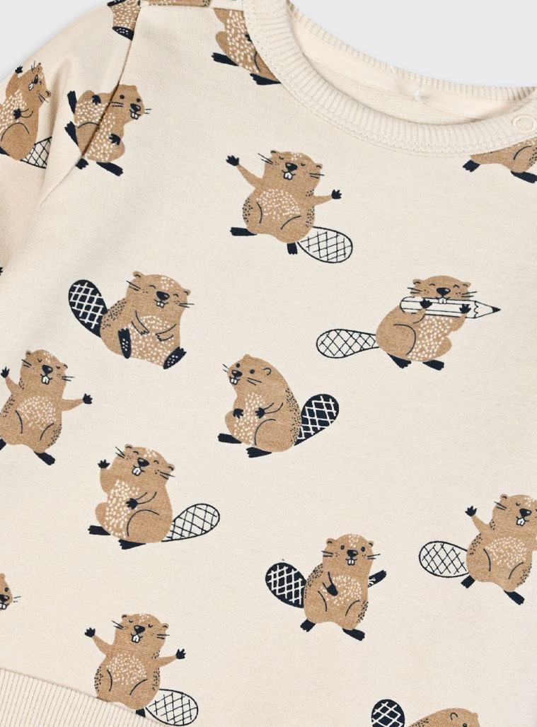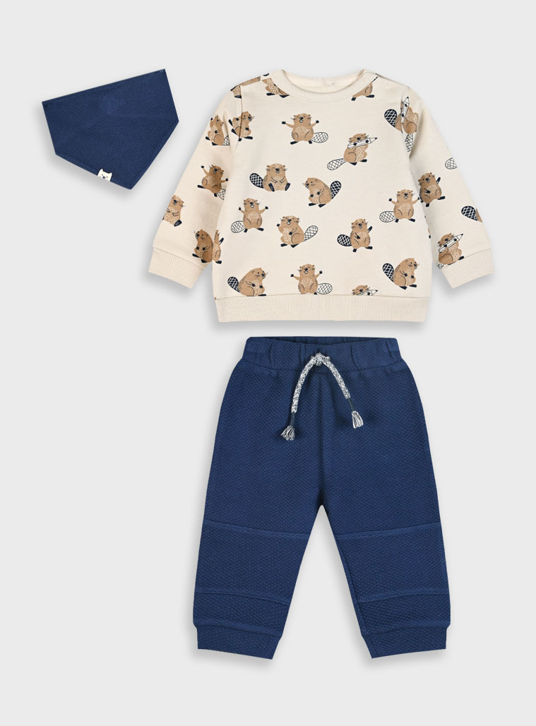 Αυτό το βρεφικό σετ είναι η τέλεια επιλογή για μικρούς εξερευνητές με στυλ! Αποτελείται από μπλούζα σε απαλό εκρού με παιχνιδιάρικα καστοράκια σε όλη την επιφάνεια, που δίνουν έναν χαρούμενο και ζωηρό χαρακτήρα. Συνδυάζεται με μπλε παντελόνι φόρμας με ιδιαίτερη υφή και διακοσμητικό κορδόνι στη μέση για άνετη εφαρμογή. Το σύνολο ολοκληρώνεται με μια μασορτί σαλιάρα, προσφέροντας πρακτικότητα και επιπλέον στυλ.