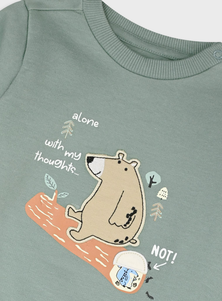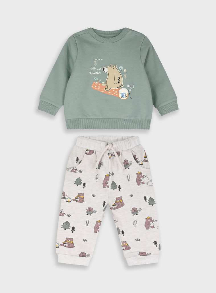 Ένα γλυκό και παιχνιδιάρικο βρεφικό σετ φόρμας για αγοράκια, ιδανικό για άνεση και στυλ κάθε μέρα! Το σετ περιλαμβάνει μπλούζα σε γκρι-πράσινη απόχρωση με χαριτωμένο σχέδιο αρκουδάκι που κάθεται σε κορμό δέντρου, πλαισιωμένο από παιχνιδιάρικες λεπτομέρειες και την ατάκα “Alone with my thoughts… NOT!” που χαρίζει μια δόση χιούμορ. Το παντελόνι είναι σε εκρού βάση με πολύχρωμα τυπώματα αρκουδάκια σε διάφορες δραστηριότητες, δέντρα και μικρές λεπτομέρειες που το κάνουν ακόμα πιο χαριτωμένο.