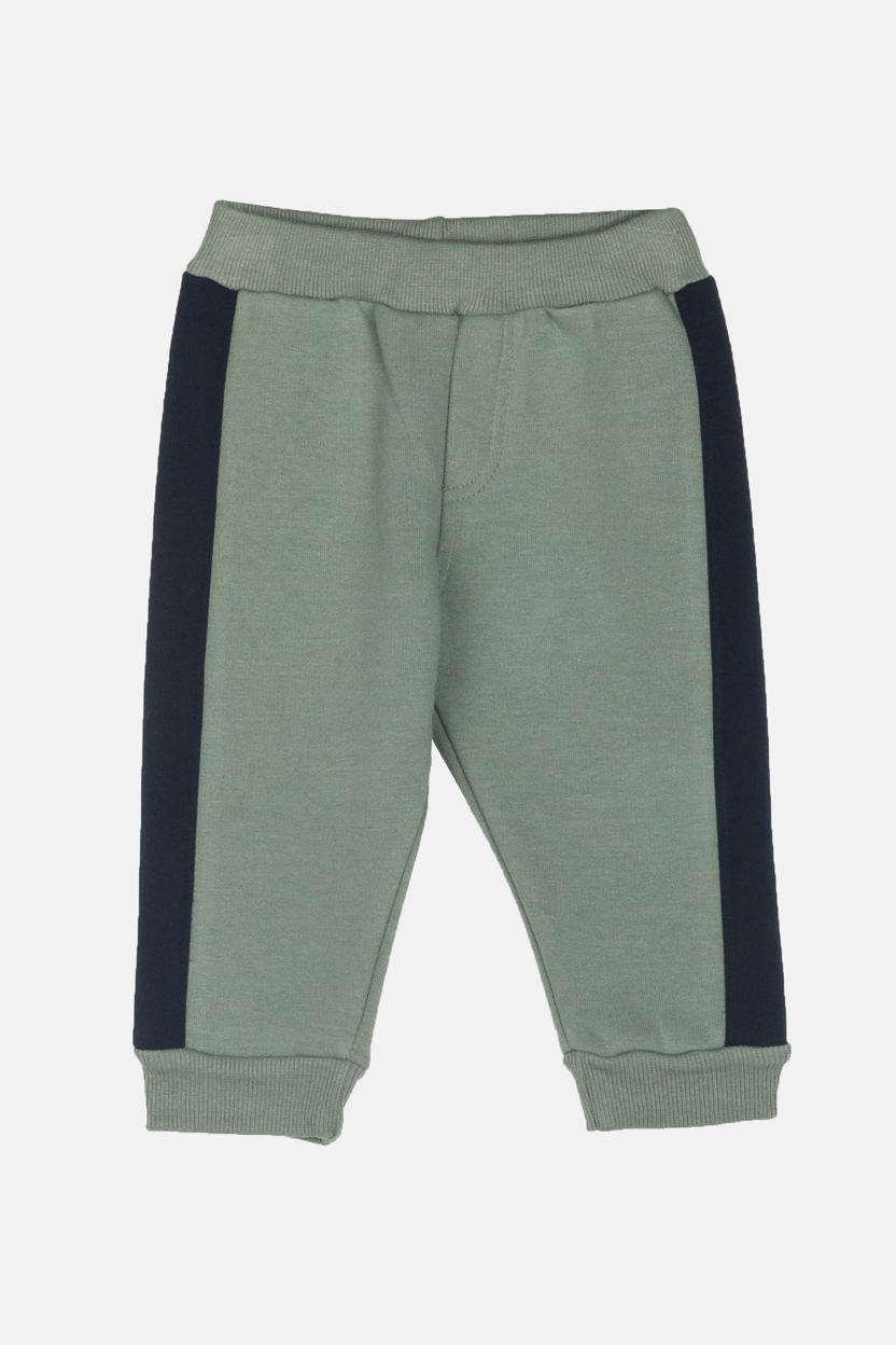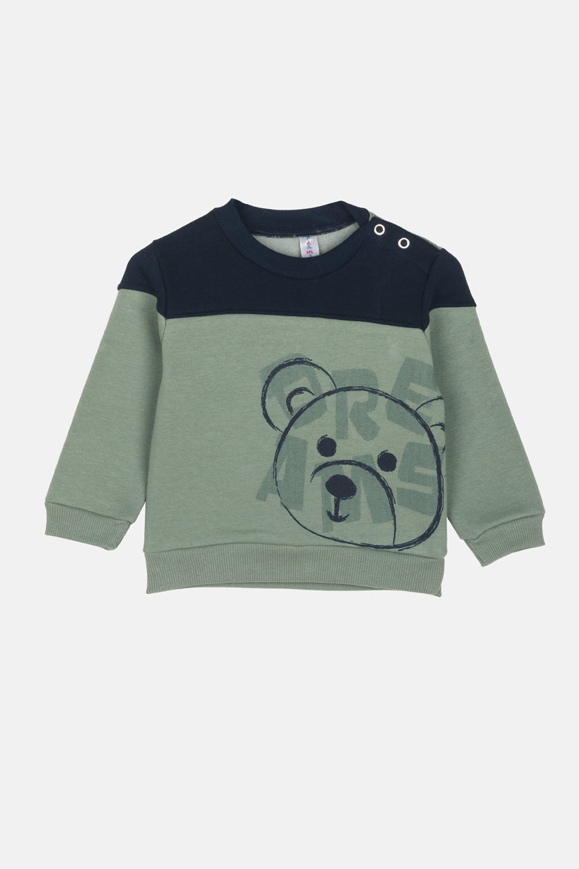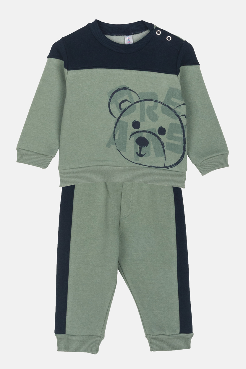 Η μπλούζα σε απαλό χακί-πράσινο χρώμα με μπλε σκούρα λεπτομέρεια και σχέδιο αρκουδάκι στο μπροστινό μέρος χαρίζει παιχνιδιάρικη διάθεση, ενώ το παντελόνι με πλαϊνές λωρίδες ολοκληρώνει ένα μοντέρνο, άνετο look.