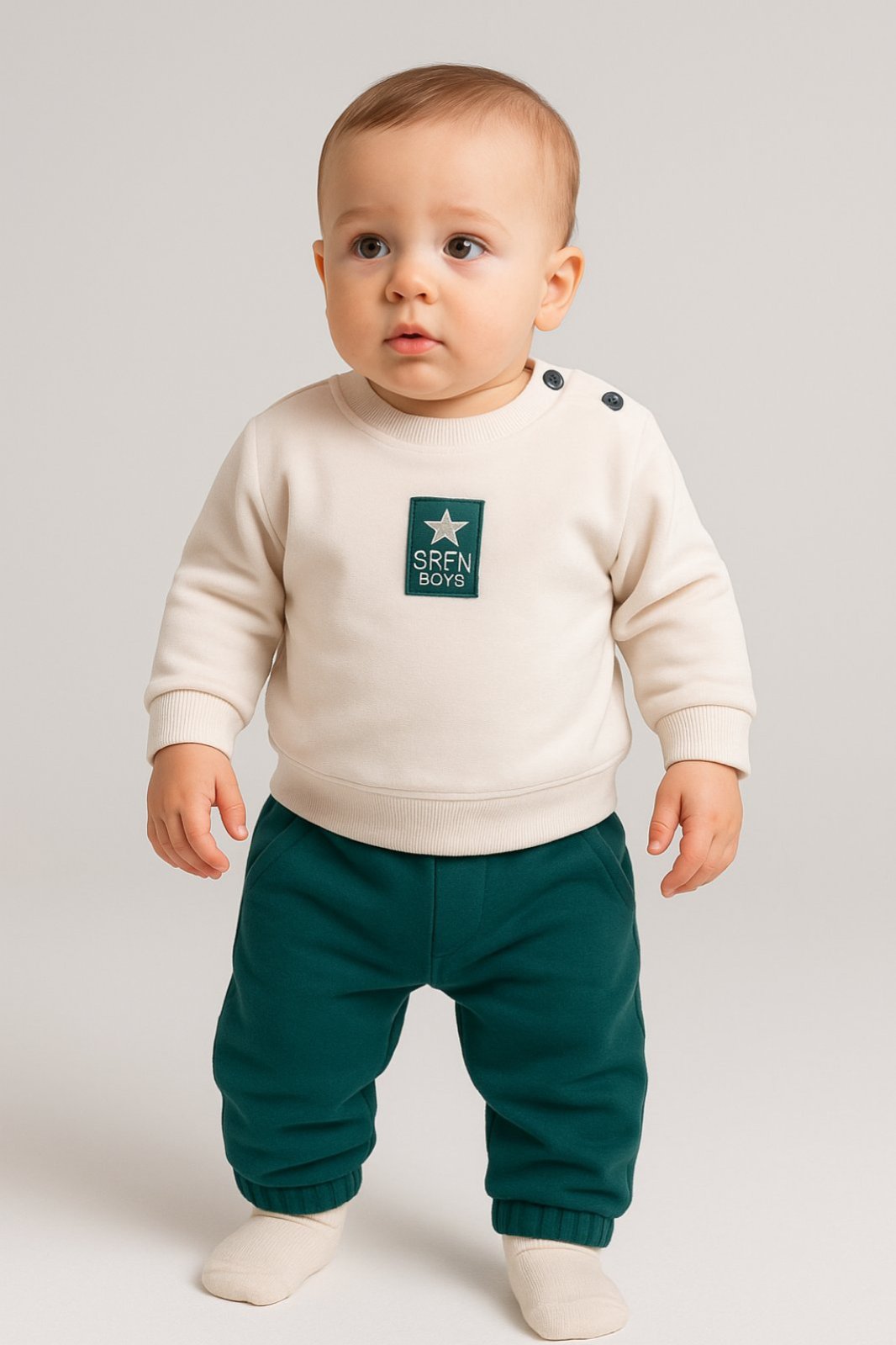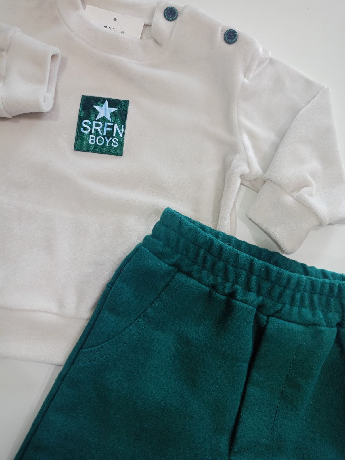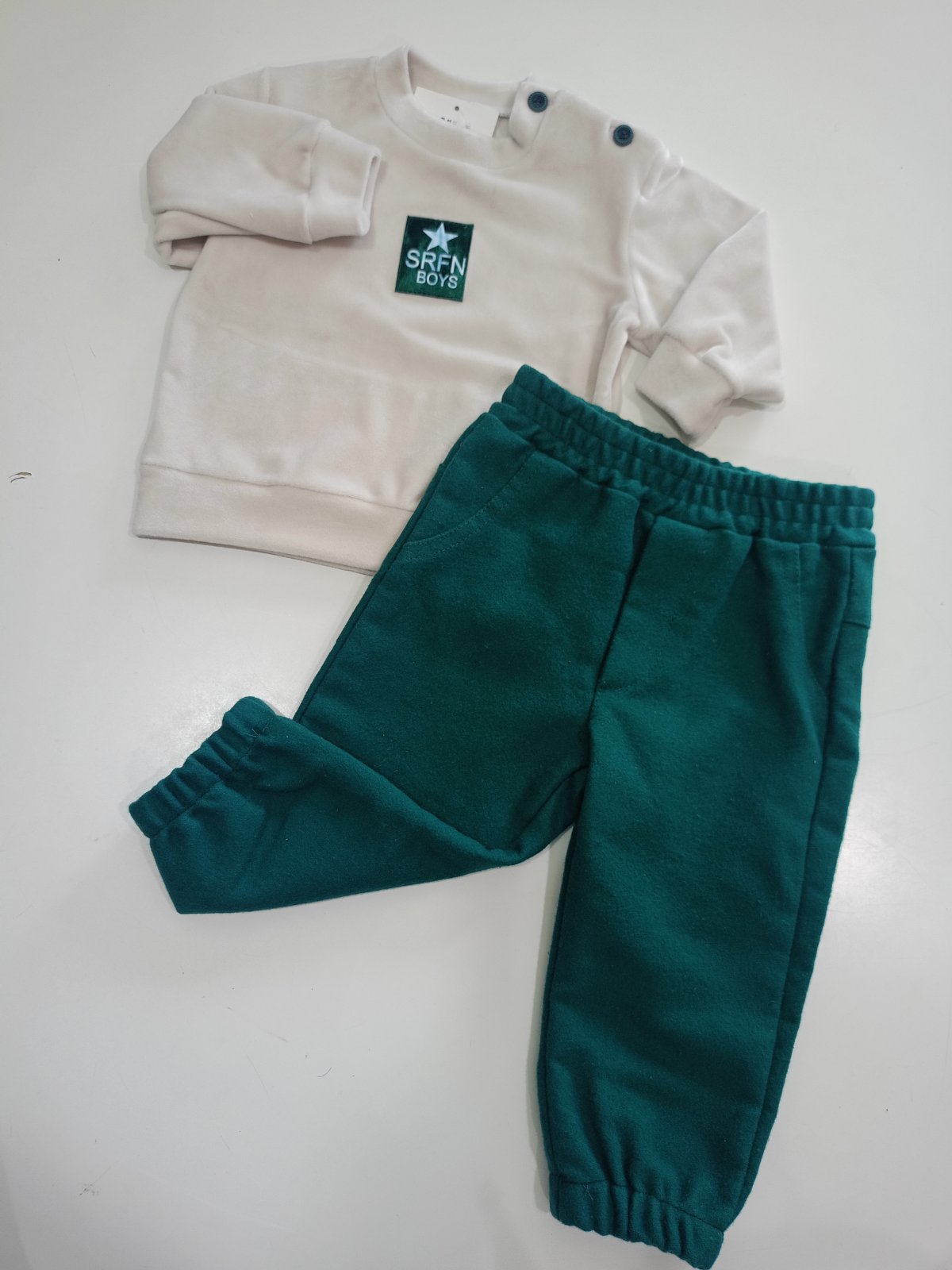 Βρεφικό σετ “SRFN Boys” με βελουτέ μπλούζα και παντελόνι – Εκρού & Σμαραγδί