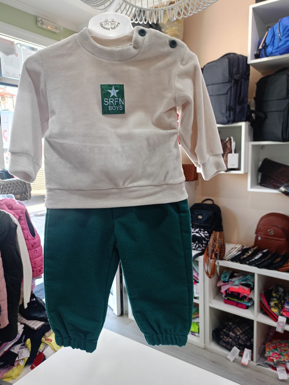 Το βρεφικό σετ “SRFN Boys” ξεχωρίζει με τη βελουτέ μπλούζα σε εκρού απόχρωση και το απαλό παντελόνι σε σμαραγδί χρώμα.